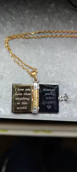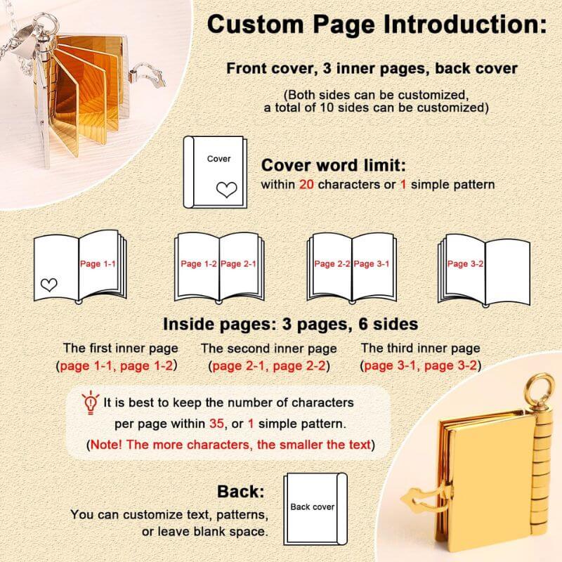 Each pendant opens like a tiny book, revealing engraved pages where you can add your own words, names, or dates — making every detail deeply personal.